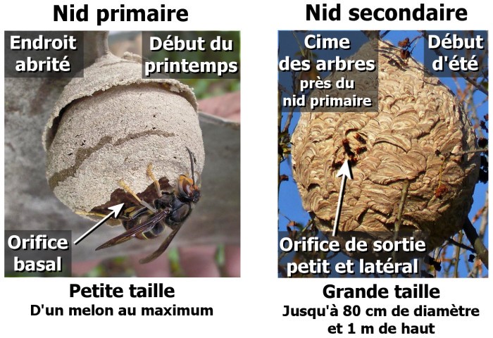 - Les nids secondaires : visibles dès le début de l’été, correspondant à une délocalisation de la colonie qui abandonne le nid primaire, trop petit.